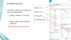 Shown on the right here is the detail of that tax free muni bond from Iowa State I used in a previous example. You can see here it has a current yield that 2.63%, what’s important for the de minimis rule is the price of the bond. This bond has a par value of 100 and a current bond price of just under $95. This means an investor purchases this bond for about $95 today, and receives $100 in principal payment at maturity, plus all the coupon payments over the years as well of course.