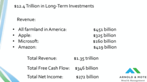 Compare that to these assets here. If you instead spent your money on these assets, the farmland would sell about $450 billion in product during a year, Apple sells about $325 billion in phones, airpods, and other products, Microsoft gets about $160 billion, and Amazon gets about $419 billion.