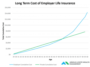 When you buy group life insurance through your employer, you will likely find that your cost increases each year as you get older. In general we find that there is typically a breakeven between employer provided insurance and private policies.