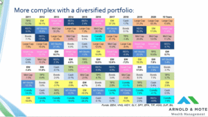 This chart here, sometimes called an asset quilt, is one of our favorites for showing how the performance of these many different asset classes differ year over year, and the value of diversification. Each column represents one year, each asset class has a different color square that has its annual performance noted.
