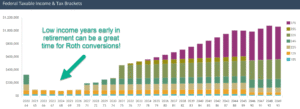 Notice that our retired couple has little to no tax burden early in retirement. At the onset of Social Security and RMDs, most of their income is taxed only at the 10% or 12% rate.