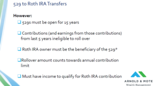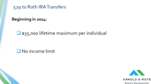 There’s a lot of fine print to this though, which we’ll cover in the next few slides. But, if you do everything right there is now the ability to transfer up to $35,000 in your lifetime from a 529 account to your Roth IRA.