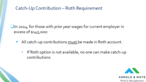 Starting next year, if your prior year taxable income with your current employer were in excess of $145,000 – All of your catch-up contributions must be made into your Roth account. You will not be able to save your catch-up contribution into a pre-tax account.