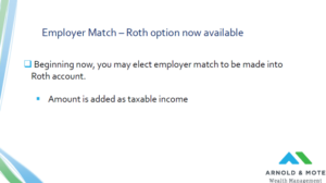 Moving on, one more Roth-related change. Beginning now, or really once your employer updates their plan documents, you may elect that your employer match be made into a Roth account. Previously, this was always a pre-tax contribution. That’s not going to be the case anymore.
