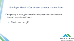 Another employer match change – Beginning in 2024, you may elect that your employer match be made towards your student loans.