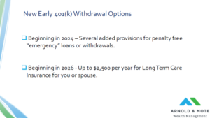 Another option is that 401(k)s can now be used to pay up to $2,500 per year in long-term care insurance penalty-free. As a reminder, the withdrawal is still taxed, but if you are 58 and paying for long-term care insurance, you could not use your 401(k) to make the payment, up to $2,500, and not worry about early withdrawal penalties.