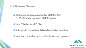 And last topic here, and another one that we just wanted to mention here but not go into depth on. If you are the owner of a small business or in business by yourself, there are a lot of new options for retirement plans for your business.