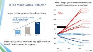 If you want to set aside cash today to pay for that $38,000 in today’s dollars for health care costs 20 years in the future, you would need to allocate about 3x that amount today if inflation continues at this pace. And if you think about needing to set aside as much as $115,000 for every year of your retirement, you will see that you need a lot of cash today. Its probably not possible unless you have just tens of millions of dollars in cash today.