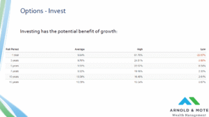 The webinar has 2 main sections. First, a look at your options for cash today. We’ll look at the pros and cons of various options like money market, CDs, savings bonds, and more to hopefully give you a better idea on the best places to save your cash today.